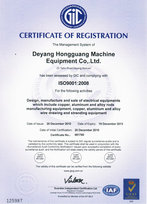 Name: ISO9001:2008 CERTIFICATE OF REGISTRATION Date: Dec 20, 2010 Valid until: Dec 19, 2013 Range: Copper, aluminum and alloy manufacturing, drawing and stranding equipments Reference: IAF